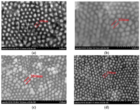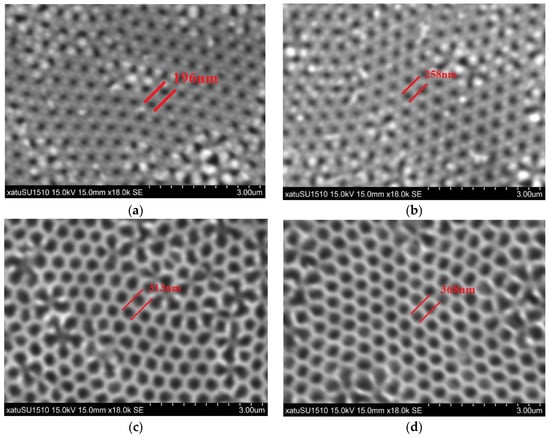 AAO, which is made from 99.999% high-purity aluminum sheet with a series of complex processes, is a kind of porous hard membrane used for preparing various nanostructures []. AAO produced by Topmembranes Technology Co., Ltd., Shenzhen, China is used in the experiment. The AAO models are as follows: DP450-200S-50000, DP450-250S-50000, DP450-300S-50000 and DP450-350S-50000. The center distance of the two adjacent holes of the four samples is 450 nm, the thickness is 50,000 nm, the exterior diameter is 25 mm, and the pore diameters are 200 nm, 250 nm, 300 nm and 350 nm, respectively.