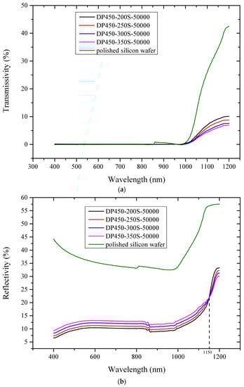 As depicted in Figure 3a, the transmissivity of the four samples is approximately zero because of the poor transmittance of light in the visible band to 1000 nm. From the 1000 to 1200 nm band, the transmissivity of samples prepared with AAO parameters of DP450-200s-50000, DP450-250s-50000, DP450-300s-50000 and DP 450-350s-50000 increased by 10.10%, 8.78%, 7.58% and 6.3%, respectively. Compared with polished silicon wafer, the transmissivity of the four samples with micro-nano structures on the surface was reduced significantly in the entire test band.
