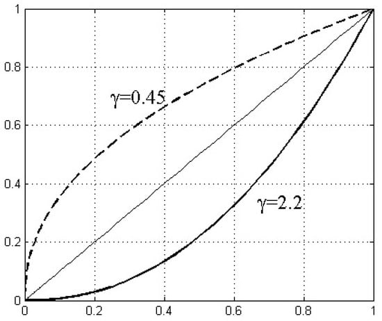 Figure 1 shows the Gamma correction curves for different coefficients. As shown, the dashed line represents , when the dynamic range of the area with small grayscale values is extended and the contrast ratio is enhanced as well []. According to the histograms of the grayscale of the background pavement, a suitable is chosen to transfer the grayscale range of the damage area to similar ones as those of the background pavement, improving the detection effectiveness and efficiency. The value is determined by: