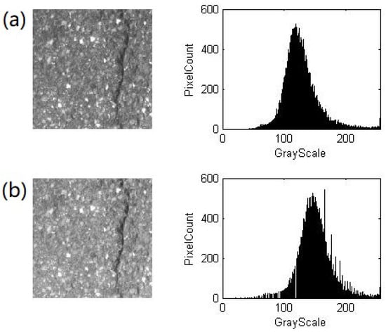 where is the peak value before the transformation and is the one after the transformation. Figure 2 shows an image of highway pavement and its histograms of the grayscale before and after the Gamma correction.