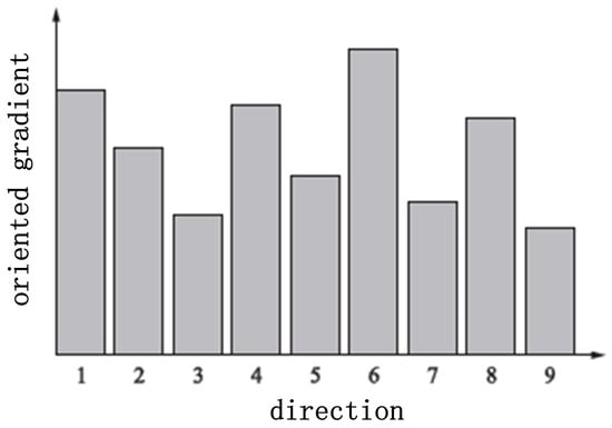 To improve the detection effect, it is efficient to combine different features of the specific object []. Compared with only extracting the HOG, the combination of the grayscale and HOG obviously contains more information. Therefore, we combined the grayscale and HOG of each cell and obtained the grayscale-weighted histogram of oriented gradients. In detail, we first calculated the average grayscale value of each unit cell . Then, the HOG of each unit cell was weighted by to obtain the weighted feature vector []: