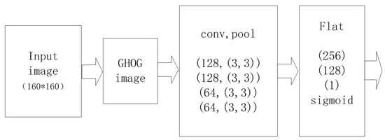 Usually, the feature vectors of all the blocks in one image are connected to form a feature descriptor, which will then be detected and classified via SVM methods []. However, the two-dimensional structure of the blocks is not taken into account by these existing methods. Moreover, the feature vectors obtained by these method are too long to achieve ideal results []. The GHOG feature vector pattern keeps the two-dimensional structure of the blocks. Therefore, it might achieve the desired effect of detecting the GHOG pattern by the CNN method. In this paper, we input the GHOG image with dimensions (19, 19, 36) into the CNN as the input layer, and the basic frame of our CNN model is shown in Figure 5, which contains four convolutional layers with activation function ReLU, kernel size = (3, 3), and strides = (1, 1). Each convolutional layer is followed by one pooling layer with max-pooling sampling and strides = (1, 1) and one fully connected layer with the sigmoid and ReLU activation functions. The detailed information of the layers and parameters is displayed in Table 1.