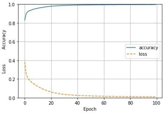 Furthermore, we conducted an experiment on the training set of 50 k, to train our CNN model with a learning rate of 0.0001, 100 iterations, and a batch size of 25, to test the proposed model on the three test sets of 50 k. The obtained accuracy and loss are shown in Figure 6. As shown, for the first 20 training times, the accuracy and loss both changed rapidly, while after training 60 times, they gradually converged to 1.0 and 0.0, respectively.