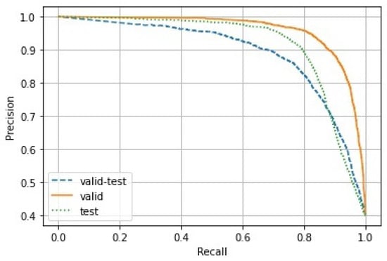 PR curves for the three subdatasets, validation–test, validation, and test.