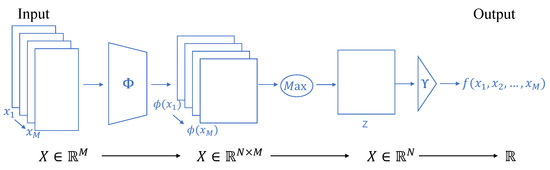 As max-pooling is a popular choice for symmetric functions, below, we will introduce how max-pooling is used in CNN to enable permutation-invariance. The pipeline is illustrated in Figure 2. Mathematically speaking, given an unordered set with items of , we say that a function f defined on the set M is