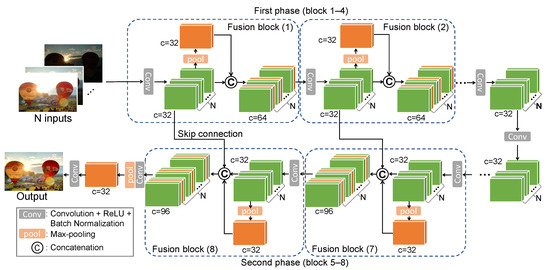 The overall architecture of IFANI is presented in Figure 3. Our IFANI adopts a symmetrical structure, containing 4 fusion blocks in the first and second phases, respectively. Besides, a bottleneck connects the first and second phases and the tail part outputs the final fused image. Suppose there are N input images (). In the first fusion block of the first phase, the network extracts the features of each image by a Conv process composed of a convolutional layer, a Rectified Linear Unit (ReLU), and a batch normalization layer. The feature extraction is realized by a batch-mechanism operation, which can be seen as one Conv module sequentially processing N inputs, or N identical Conv modules processing N inputs in parallel. No matter which implementation is used, it essentially learn one filter kernel instead of N different kernels. This batch-mechanism operation is applied for all subsequent Conv modules. Then, the N feature maps are pooled by max-pooling to obtain the most prominent features among them. We concatenate the original N feature maps with this pooled feature so that every feature map gains information from other feature maps, which plays a role in information fusion. The concatenated feature maps are fed to the next fusion block, and we repeat the same operation until the end of the first phase (the 4-th fusion block). The second phase is composed of 4 similar fusion blocks. The difference is that feature maps in the first phase will be reused through skip connections for feature map concatenation, preventing the network from losing low-level details of the input images. A bottleneck module composed with two Conv plus one more convolutional layer connects the firs and the second phases. After the 8-th fusion block, we feed the last group of concatenated feature maps into a Conv module to reduce their channels from 96 to 32. Then we apply the max-pooling to obtain the last fused feature map, which reconstructs the fused image through the last Conv module. The filter size and trainable parameters of each layer are illustrated in Table 1.