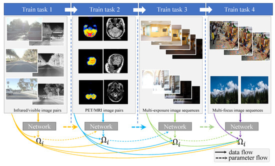 Continual learning for four different fusion tasks. The solid lines below represent the data flow. The thick solid lines represent the data used to train the network. The thin solid lines represent a small subset of data used to calculate the importance parameter . The dotted lines indicate that the network parameters are passed to the training of the next task.