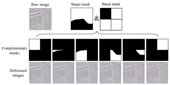 Here, we take the dataset DIV2k [42] as the raw images to synthesize the defocused images. The DIV2k dataset contains 1000 high definition high-resolution images with a large diversity of contents. We generate a series of binary masks to decide the out-of-focus area of defocused images. The number of binary masks decides the number of defocused images in each set. To generate such binary complimentary masks, we design two groups of masks in advance. The first group is basal masks, including 4 binary masks as shown in Figure 5a, which separate a patch into 1, 2, 3 and 4 parts, respectively. The other group includes 213 binary masks of various shapes with the size of , called shape masks (Figure 5b). The complementary masks can be defined by one basal mask and a chosen shape mask with AND-operation. Figure 6 gives an example of the binary complementary masks . We take the high-resolution image from the DIV2k dataset and crop a image patch as the raw clear image, denoted as . The Gaussian filtering with a standard deviation between 1 and 2 is applied to get the blurred image . Then the i-th defocused image is generated by the following operation: