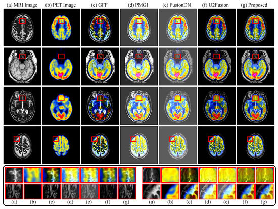 Fusion results for PET/MRI images on Havard dataset of our proposed method and four image fusion methods: GFF [45], PMGI [46], FusionDN [33] and U2Fusion [8]. The zoom-in patches of corresponding images (a–g) are shown in the black box.