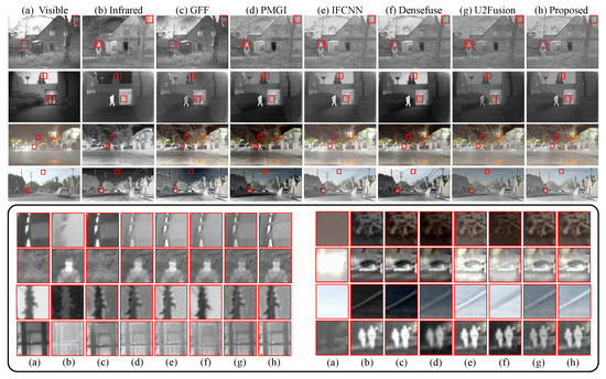 Infrared and visible image fusion results of our proposed method and other five methods (GFF [45], PMGI [46], IFCNN [32] and Densefuse [5]). Images in the top two rows come from the TNO dataset, and images in the bottom two lines come from the RoadScene dataset. The zoom-in patches of corresponding images (a–h) are shown in the black box.