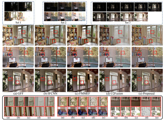 Multi-exposure image fusion results of four image fusion methods (GFF [45], IFCNN [32], FMMEF [53], U2Fusion [8]) and our proposed method. The zoom-in patches of corresponding images (a–e) are shown in the black box.