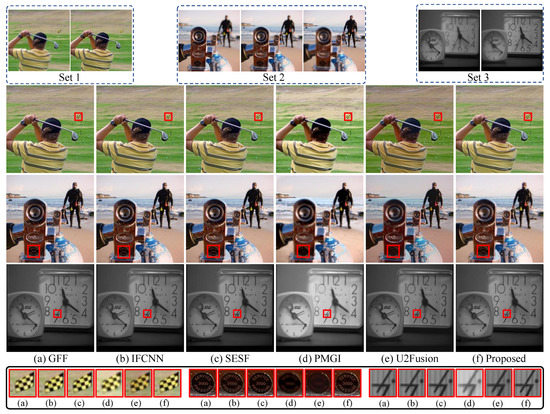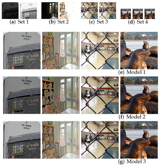 We collect 220 pairs of MRI/PET images on Havard Medical School (https://www.med.harvard.edu/aanlib/home.html (accessed on 13 February 2022)) from different medical cases of illness and divide them into a training set (200 pairs) and test set (20 pairs). As for infrared/visible image fusion, we adopt RoadScene (https://github.com/jiayi-ma/RoadScene (accessed on 13 February 2022)) for training. This dataset contains 221 aligned infrared/visible image pairs containing rich scenes. In addition, we use datasets from [43] for multi-exposure image fusion training, which provides multi-exposure sequences of 589 scenes with 3 to 18 exposure levels as well as corresponding high-quality reference images. The reference HDR image is the best fusion image manually selected from the fusion results of 13 recently developed MEF and HDR algorithms that are used as ground truth during training. The training data for multi-focus image fusion is generated according to Section 3.3. All source images are cropped to image patches with a size of . The filters size of the network are set to .