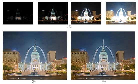- Ram Prabhakar, K.; Sai Srikar, V.; Venkatesh Babu, R. Deepfuse: A deep unsupervised approach for exposure fusion with extreme exposure image pairs. In Proceedings of the IEEE International Conference on Computer Vision 2017, Venice, Italy, 22–29 October 2017; pp. 4714–4722. [Google Scholar]
