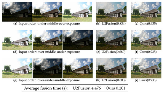 In Figure 13, the multi-exposure set contains 3 images with under, middle, and over exposures. For image order in Figure 13a, U2Fusion first fuses the under-exposure and middle-exposure images. Then the intermediate output is combined with the under-exposure image to obtain the final fused image (Figure 13c). This recursive fusion also applies for image order of Figure 13b,g and for U2Fusion to get fused images Figure 13e,h. Our method handles these three orders in the same way (Figure 10b) and obtains the corresponding fused images in Figure 13d,f,i. As can be seen, the fused images of U2Fusion for three input orders have big differences and have lower quality than our fused images according to MEF-SSIM [30] assessments. Lacking the global vision of all source images, U2Fusion can not extract the most important details among all images. By contrast, our method is permutation-invariant that can process all images in one shot without remembering their orders. It obtains the same and also high-quality fused images for different input orders. Moreover, our one-shot fusion method is more time-efficient ( s/set) than the recursive fusion strategy ( s/set).
