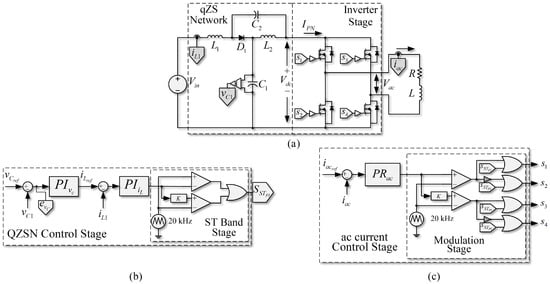 PWM linear control scheme, based on PI controllers for -link and PR controller for the load. (a) Quasi-Z-source inverter with RL load; (b) PWM control strategy on the side; (c) PWM control strategy on the side of the inverter.