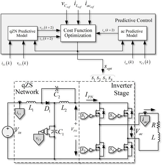 It is possible to use a finite control set model predictive control (FCS-MPC) strategy to improve the proposed converter’s dynamic behavior, since this kind of control method can consider all the nonlinearities in the system. The proposed control scheme considers a model that allows the prediction of the different future states of the converter by using information acquired in a present condition and all possible combinations of the switches in the topology. Valid switching states of SP-qZSI can be seen in Table 1.