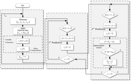 A typical FCS-MPC scheme used in SP-qZSI is presented in Figure 3. The proposed strategy controls both the inductor current and the capacitor voltages of the qZSN simultaneously. The ac current is also managed in the same strategy. The proposed algorithm of the predictive scheme is shown in Figure 4. It is important to note that regulation of voltages and can be achieved by regulating only , and regulation of currents and can be achieved by regulating only ; then, only the future states of and need to be predicted by the proposed strategy.