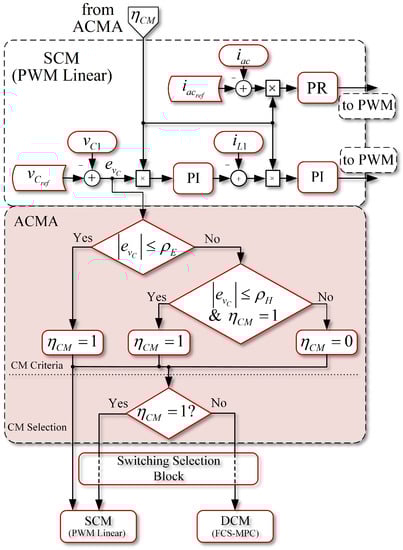 To alternate between each CM, it is possible to define an alternating control mode algorithm (ACMA) which entails using a selection variable , as described in [27]. The following steps are required to design the ACMA: (a) selecting the control modes that will work on steady state and transient state independently, and (b) defining the criteria to switch between CMs.