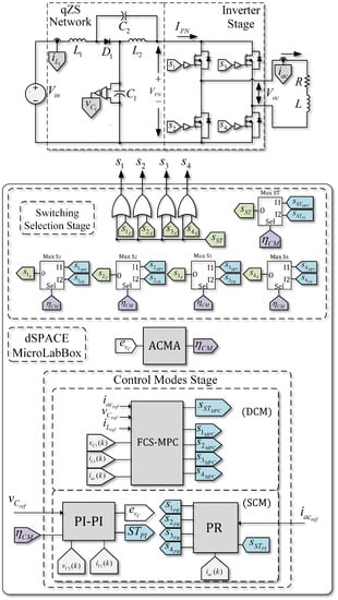 The algorithm presented above allows for switching between two control strategies according to the operation regime under which the system is working. In Figure 6, the general control scheme with ACMA for SP-qZSI is presented. The implementation consists of four main stages. In the first stage, or power stage, sensing of the signals is carried out. In both control modes, it is necessary to measure , , and ; thus, there are no differences in terms of implementation.