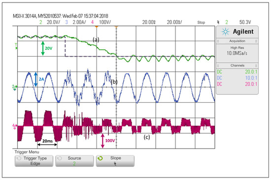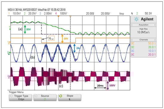 First, only the PWM linear control explained in Section 3—A will be considered, which is equivalent to forcing the system to operate under SCM at all times. Figure 7 shows that, in the face of a step change in the voltage reference of the capacitors from to , the controller is able to control the voltage adequately, that is, each capacitor voltage, as well as the load current. The capacitor voltage response includes a small overshoot and then the voltage is stabilized to its desired value, where the settling time is equivalent to two operating cycles. It is possible to see that the load current is barely affected when the change is performed, and that its lowest is 5.1%. Additionally, a significant change in the inverter output voltage is observed.