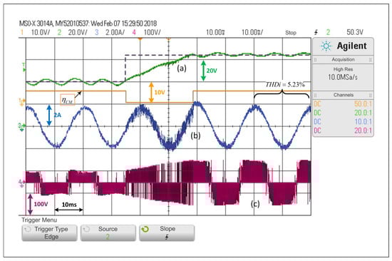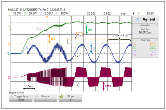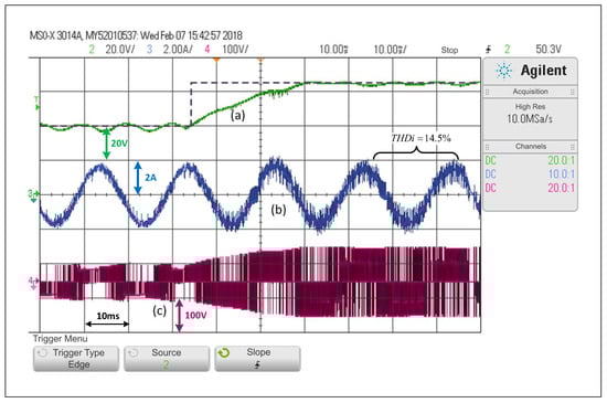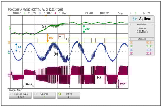 Figure 14 shows that during a start-up with null initial conditions, and given the references in the and sides, the system will start in DCM. In fewer than two cycles, it will reach the desired operating point with 65 V and 1.8 A of amplitude in the current, then the SCM is activated, which allows the converter to work under the PWM linear control scheme. This last test shows the possibly major advantage of the scheme, considering that in a system operating with linear controllers only, other strategies are usually needed to bring the system into a valid operating point.