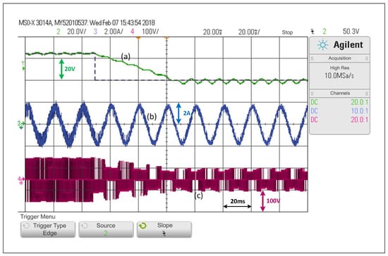 Response of the alternating control scheme with ACMA proposed for SP-qZSI in a start-up, 0 to in capacitances and 0 to 1.8 A in the load: (a) voltage variable response, (b) load current response, (c) inverter output voltage.