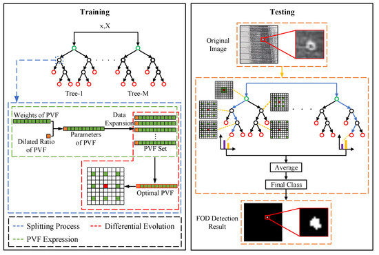 The rest of this paper is organized as follows. The overall detection framework is described in Section 2, including the learning process of PVF using differential evolution algorithm, and the training and testing of random forest. In Section 3, the proposed FOD detection system used in this paper is introduced. In Section 4, the effectiveness of the proposed detection method is verified on the FOD dataset. Comparative experiments between this method and other methods are also introduced in this section. Section 5 and Section 6 provide the discussion and conclusions of this paper, respectively.