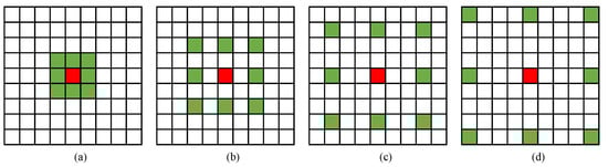 The grid rectangles represent examples of the learned dynamic filters with different weights and receptive fields, the red squares represent the input pixel, and green squares represent the pixels used to calculate the pixel visual feature (PVF). (a) r = 1. (b) r = 2. (c) r = 3. (d) r = 4.