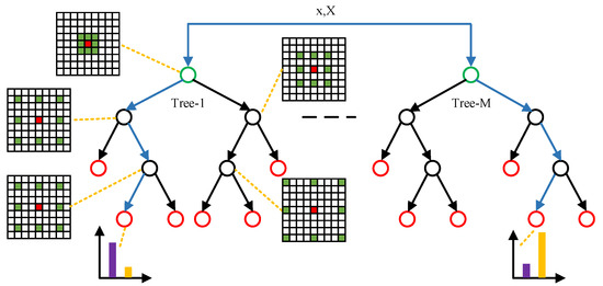 Random forest combines multiple decision trees, as shown in Figure 3. Due to the combination of multiple decision trees learned using different data and features, random forest is robust to irregular data and noise [25]. In random forest, each decision tree consists of a root node, splitting nodes, and leaf nodes. The spatial location of the input pixel x and the grayscale image X are inputs of each decision tree. The input pixel is classified into a child node according to the splitting criteria , where is the PVF of the pixel x at the node n. When the input pixel reaches a leaf node, the classification is terminated. The probability of being each class c at each leaf node is learned in the training process and used in the testing process.