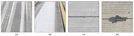 Examples of airfield pavement disturbances: (a) tire marks; (b) marker lines; (c) splice joints; (d) holes.