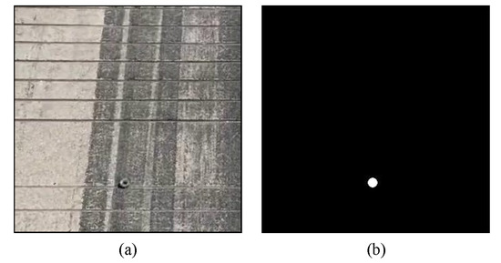 The FOD dataset was collected by our research group at Shahe Airport in Beijing, China. These images only include the runway pavement, not the sky, grass, or other regions. The FOD dataset contains 1800 RGB images (with a resolution of 1920 × 1080). The dataset is made up of 14 different object categories. Six categories consist of real FOD samples, including nuts, screws, steel balls, gaskets, rubber blocks, and stones. The other 8 categories contain standard FOD samples, including metal spheres, marble spheres, glass spheres, plastic spheres, metal cylinders, marble cylinders, glass cylinders, and plastic cylinders. A single image contains 0 or multiple FODs and there are a 4375 annotation instances. The number of different FOD in the dataset varies from 250 to 350. The area of the FOD samples in the images is less than 15 × 15 pixels on average. Here 70% of the FOD dataset is used as training data, and the other 30% the testing data. To achieve the diversity of FOD dataset, different runway surface disturbances and FOD samples are collected. Runway surface disturbances include tire marks, marker lines, splice joints, holes, and others (Figure 6). The original images were labeled as FOD and ground by labelme software, as shown in Figure 7. The RGB images were used for visual interpretation. The pixel-precise ground truths were manually checked by 5 operators, who would vote for determination in terms of controversial image region.