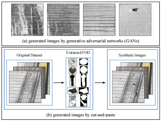 In this paper, for introducing real-world variations and increasing the number of FOD in dataset, the dataset is augmented using two strategies. First of all, we use generative adversarial networks (GANs) [33] to generate high-quality airfield pavement images. The generated images drawn from the generator net after training are shown in Figure 8a. Second, inspired by recent success of synthetic object detection datasets [34] and the fact that many airfield pavement images do not have FOD, a cut-and-paste strategy to synthetically insert FOD into airfield pavement images for data augmentation is employed. As shown in Figure 8b, we first cut numerous FOD objects from the original FOD dataset, and generate synthetic airfield pavement images by inserting FOD in the original images. In this paper, OFOD is used to represent the original FOD dataset and SFOD is used to represent the set of the synthetic FOD dataset and the original FOD dataset.