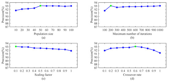 Figure 9a shows the performance of the proposed method when the population size changes. The performance is improved with respect to the population size. However, when the population size is greater than 50, its impact on the detection performance becomes negligible and can even be ignored. Figure 9b uncovers the influence of the maximum number of iterations. When the maximum number of iterations is less than 200, the performance is significantly improved, yet when the number of iterations is more than 200, the improvement of the performance is not obvious. Figure 9c presents influence of the scaling factor. It can be observed that the detection performance deteriorates with the enlargement of scaling factor. Figure 9d displays the influence of the crossover rate. It can be seen that the procedure is sensitive to the crossover rate, and the crossover rate with 0.6 performs the best.