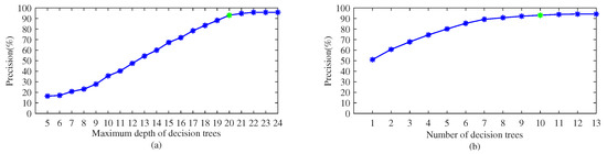 Figure 10a shows the relations between detection performance and the maximum depth of decision trees. It can be observed that the maximum depth of decision trees is nearly proportional to the performance when the maximum depth is less than 22. The improvement is not obvious when the maximum depth is greater than 22. The possible explanations that a large number of the maximum depth leads to over-fitting. Figure 10b shows the relations between detection performance and the number of decision trees. It can be observed that the performance becomes better when the number of decision trees increases, though eventually they would level out. In detail, when the number of decision trees is less than 7, precision can be increased by about 7% by adding a decision tree. However, when the number of decision trees is greater than 7, precision can only be increased by about 1% by adding a decision tree. This proves that when the number of decision trees exceeds a certain value, increase in the number of decision trees only has a limited improvement effect on the performance.