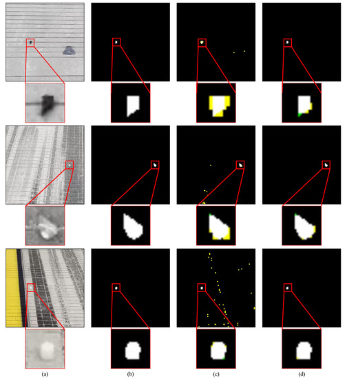Qualitative comparison between the proposed method and Deeplabv3+: (a) original RGB images; (b) ground truths; (c) results of Deeplabv3+; (d) results of the proposed method. The white region indicates the pixels that are correctly detected as FOD, the black indicates the pixels that are correctly detected as background, the yellow indicates the pixels that are incorrectly detected as FOD, and the green indicates the pixels that are incorrectly detected as background.