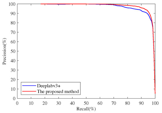 Table 2 and Figure 12 show the comparison of the proposed method with Deeplabv3+, trained on the SFOD dataset. In Figure 12, there is a nut in the first row, a gasket in the second row, and a screw and a steel ball in the third row. Compared with Deeplabv3+, the precision of the proposed method is increased by 0.91% and the recall 3.06%. The results in Table 2 demonstrate that the proposed method has a better detection effect on small-scale FOD than Deeplabv3+. The Precision-Recall (PR) curves of the two methods are shown in Figure 13. The results in Figure 12 demonstrate that the proposed method and Deeplabv3+ are all robust to the interference and noise of airfield pavement. The detailed images in Figure 12 show the FOD edge detection results of the two methods. Deeplabv3+ records many omission errors and false alarms in FOD edge detection. In conclusion, compared with Deeplabv3+, the proposed method performs better in control of omission errors and false alarms, and in the display of FOD edge details.