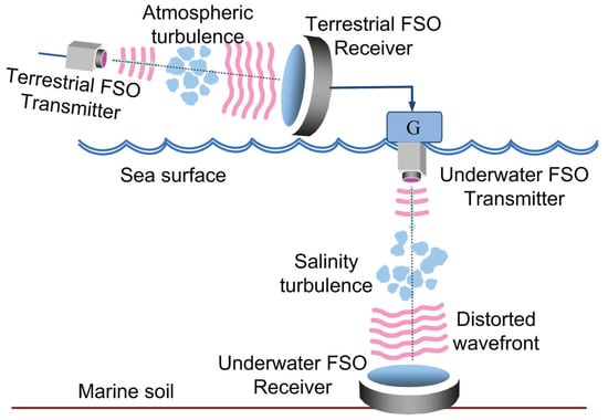 Nevertheless, both channels present limitations in achievable performance imposed by the atmosphere and underwater transmission environments. First, in the case of terrestrial FSO systems, the main limiting agent is the atmospheric turbulence, which results in fluctuations in both the intensity and the phase due to the random inhomogeneities in the medium refractive index [,]. The effect of these inhomogeneities is known as scintillation, which involves random fades of the received optical signal intensity. To model this randomly fading characteristic of the atmospheric channel under variable turbulence conditions, extensive research has been performed by the scientific community. Accordingly, different mathematical models for the probability density function of the received irradiance have been proposed so far [,,,,].