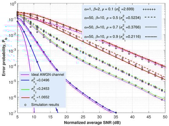 In (12),  denotes the average over turbulence. Thus, and for the sake of consistency with notation in Equation (9), we can identify , with h representing the random normalized irradiance fluctuation. Therefore, the ABER, , is calculated by averaging  over the PDF of the irradiance, . Hence, we have the following.