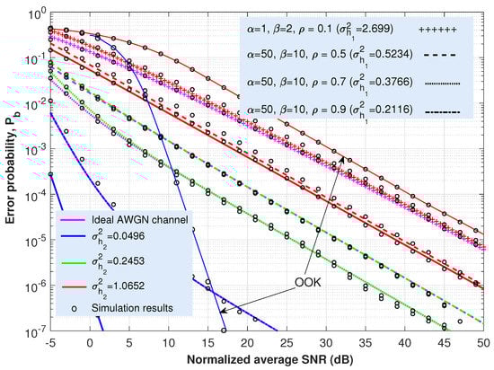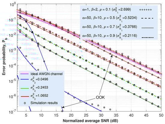 In (26), the scintillation index parameters  and  were obtained after the curve-fitting approach. For the case of both plane wave and mostly salinity-induced turbulence, we can establish ,  and , as summarized in Table 3 in []. Then, and for the values of  considered in Figure 3, Figure 4, Figure 5 and Figure 6 (0.0496, 0.2453 and 1.0652), we can obtain their associated underwater optical wireless communication link distances: ,  and  m, respectively. Namely, this fact means that, when the distance is 7.07 m, the scintillation index reaches a value of 0.0496; but the longer the distance, the stronger the intensity of turbulence and, for example, when  m, .