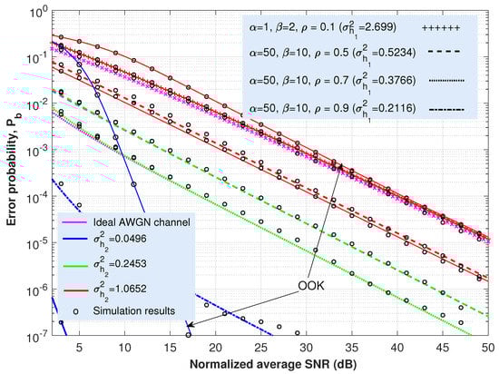 with  denoting the signal current in the absence of turbulence-induced fading, with , R and  representing the attenuation coefficient associated with the medium (not considered in this paper), the responsivity and the average of transmitted optical power, respectively. In (10),  represents the variance associated with the ISI affecting the system in the optical underwater channel, as commented in Section 2. There, it was described how the ISI term is affected by , , since it results from multipath interference and its inherent waveform time dispersion. Following [,], we have assumed in (10) that the ISI interference is Gaussian distributed.