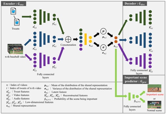 Several different modalities must be considered when using both tweets and videos. To consider these modalities, many researchers have proposed several methods that focus on the relationship among these modalities, such as tweets and visual and audio modes [,,,,]. The video-text retrieval method [] learns two joint spaces between multimodal features. It [] learns multimodal embeddings across different modalities using deep canonical correlation analysis []. The method in [] proposes a convolutional neural network-based medical image fusion algorithm to make the medical diagnosis more reliable and accurate. By obtaining medical images from different modalities, complementary as well as redundant information can be obtained. Furthermore, by combining the images from the camera and active sensor information, the method in [] demonstrates how it outperforms a single modality in end-to-end artificial driving. The method in [] uses a multimodal variational autoencoder (MVAE) [] using tweets and visual information as the latent variable model (LVM) to detect fake news. The effectiveness of using LVM to consider both videos and tweets has also been reported in [,]. The MVAE can discover correlations between modalities by learning shared representations. Thus, it is expected that MVAE is effective in predicting important scenes in baseball videos using both tweets and videos. For constructing MVAE-based methods using tweets and videos, the following problem is considered: viewers watching baseball videos post tweets inspired by several previous events, such as an RBI hit and home run. Thus, since tweets and multiple corresponding events have time lags, the conventional methods [,] detect important scenes through the consideration of tweets and events. Specifically, the conventional method [] detects important scenes via a time-lag-aware multimodal variational autoencoder that has the encoder considering the time lags between tweets and events, and the conventional method [] detects them based on a generative adversarial network-based approach using features transformed via bidirectional time-lag aware deep multiset canonical correlation analysis. However, these methods cannot simultaneously train a time-lag aware feature transformation network and network for the detection of important scenes. By constructing an end-to-end LVM-based approach with consideration of the relationships between baseball videos and tweets, an accurate prediction method of important scenes can be expected.