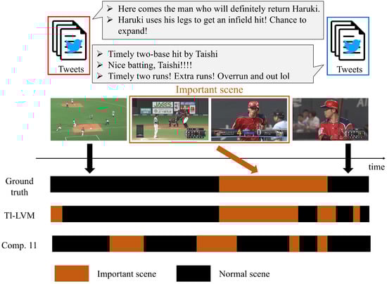 Comps. 10: A method that predicts important scenes using a long short-term memory [], which is effective for the relationships between time series data. Similar to Tl-LVM, videos and tweets are input, and the probabilities of the scene being important are output.
