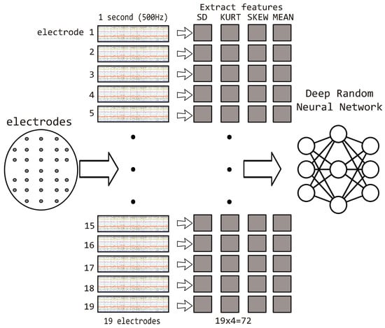 In this study, a novel RNN-based deep learning model was proposed for the multi-class classification of epilepsy data. The data were obtained from a publicly available dataset []. Each sample in the dataset contained 19 channels, and each channel represented a data stream coming from a single electrode with a sampling rate of 500 Hz. The total number of samples in the training and testing data was 7011 (90%) and 779 (10%), respectively. In the pre-processing phase, features (standard deviation, kurtosis, skewness, and mean) were extracted from every 1 s segment of each electrode, as shown in Figure 1. The extracted features, i.e., standard deviation, kurtosis, skewness, and mean, have been used in literature for the classification of EEG data of patients with Alzheimer’s disease and mild cognitive impairment [] achieving 95% accuracy and epilepsy [] with an accuracy of 99.7%.
