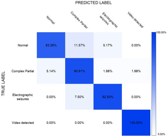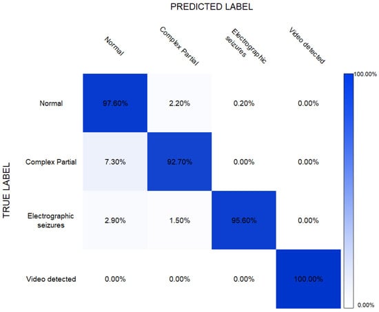 The confusion matrix shown in Figure 6 shows the accuracy of the CNN model achieved during the classification of the different classes, including normal and epilepsy seizures. It could be noted that the CNN model classified “complex partial seizures” with 90% accuracy, while “electrographic seizures” and “video-detected seizures” were classified with an accuracy of 91% and 100%, respectively. The normal signals were identified with 97.40% accuracy.