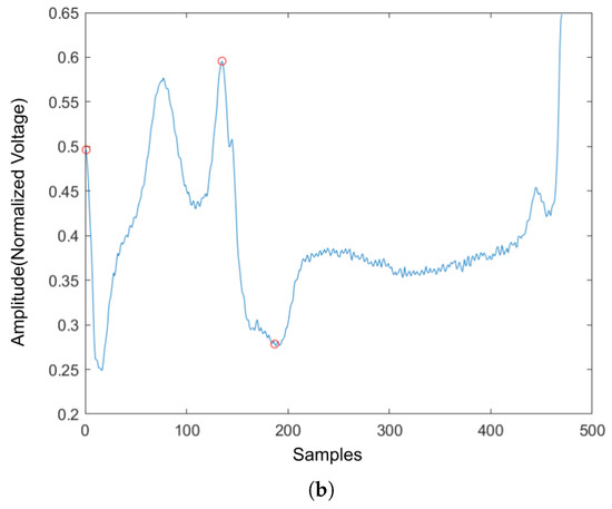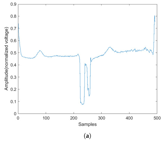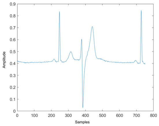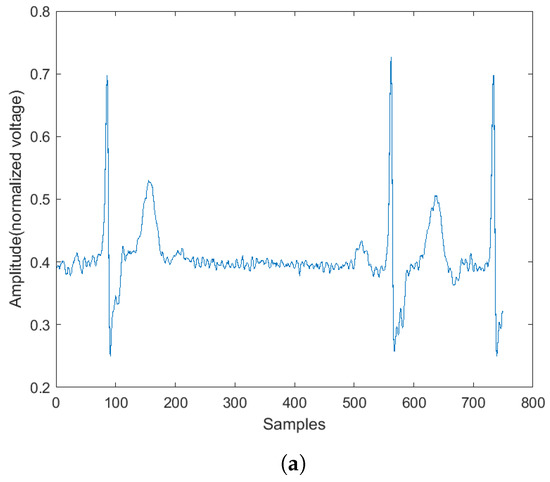 The signal pre-processing steps consist of re-sampling, normalization, data extraction, and balancing. The ECG signals in the MIH-BIH arrhythmia dataset have a 360 Hz sampling frequency, and the signals in the European ST-T dataset have a 250 Hz sampling frequency. To make the sampling frequency at the same rate, both signals were down-sampled at a rate of 250 Hz, with an antialiasing lowpass Filter provided by Matlab [29]. The algorithm starts by inserting 250 zeros to the original signal to obtain the up-sampled signal . Then is filtered by an FIR antialiasing filter that uses a Kaiser window method to maintain the original shape of . Finally, 250 samples in the are discarded to obtain the down-sampled signal . Next, the signals from both datasets are normalized between 0 and 1 using the min–max normalization formula: