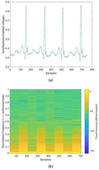 Abnormal ECG rhythm and its corresponding spectrogram. (a) Normal rhythm plot. (b) Normal rhythm spectrogram.