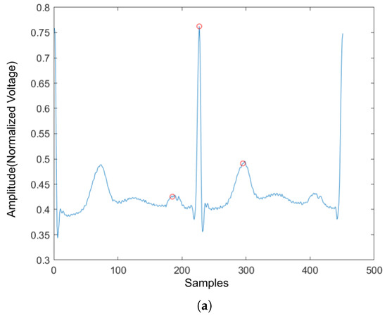 Four ECG interval measurements are also used as features. They are average RR interval length, average QRS complex length, average PR interval length, and average QT interval length. The detection tool used for detecting the Q wave and T wave was ‘ecgpuwave’, which is provided by PhysioNet [28]. The ‘ecgpuwave’ uses Pan–Tompkins algorithm [32] to detect the QRS complex. Then the detector detects the P peak and T peak based on the detected R peaks. For P and T peak detection, the detector defined search windows before and after the R peak. The detector searches the maximum and the minimum values in the defined window. The P and T wave peak is assumed to occur at the zero-crossing between the maximum and the minimum values in the search windows. Figure 7a,b show the examples of the P-QRS-T detection using the ‘ecgpuwave’ detector. These two examples represent the most common situation for detecting the P, R and T peaks on the heartbeats with the ‘ecgpuwave’ detector, which are the peaks on abnormal heartbeats that cannot be fully detected and the detection on normal heartbeats are perfectly detected. Therefore, for undetected peaks, its corresponding interval length and peak value will be set to 0.
