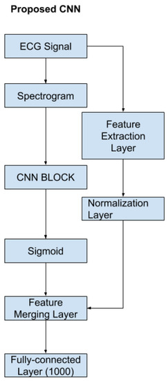 The proposed Convolutional Neural Network (CNN) consists of a feature-extraction layer, a normalization layer, a CNN block, and a feature-merging layer. The proposed CNN structure is shown in Figure 8. According to the figure, the original input is the raw ECG signal. From the original input, the program could produce the STFT spectrogram and the handcrafted features in Section 2.2.8. Once the handcrafted features are obtained, the normalization layer will normalize those features to a range between [0, 1] so that each feature contributes the same weight to the classification. The STFT spectrogram was sent to the CNN block and a sigmoid layer. The CNN block could be any popular CNN structure such as VGG-19 CNN, plain 34-layers CNN, 34-layers Residual Net (shown in Figure 9). The primary purpose of the CNN block was to extract the features from the spectrogram using convolutional layers. The sigmoid layer acts as a normalization layer, converting CNN features to be in the range [0, 1] so that the CNN features will have the same weight as the handcrafted features at the final layer. Once the CNN and handcrafted features are obtained, the feature-merging layer then combines the normalized handcrafted features with the extracted features from the spectrogram. Finally, the merged feature vector will input a fully connected layer to produce the final classification. The output value of the fully connected layer is in the range of 0 and 1 where the value of the final classification label will be decided by: