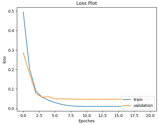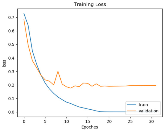 Most deep neural network architectures are prone to over-fitting, meaning that if the accuracy of the network on the training set is increased, the accuracy of the network on the actual test set may not improve. This situation indicates that the model is overfitting the training set and cannot generalize all data. During the training of the CNN model, the following two methods were used to prevent over-fitting. The first one consists of adding a dropout layer after the fully connected layer, and the second consists of using an early stopping technique, as shown by [36]. After each training epoch, the model predicts a validation set to determine accuracy. The training process stops if the validation accuracy drops two times in two consecutive epochs. The training and testing were computed on a workstation with Intel Core i5-8400 CPU and Nvidia Geforce GTX 1080 GPU. One can see in Figure 10 and Figure 11 the training and validation of rhythm and heartbeat classification loss function value vs. epochs. It is clear that both training loss and validating loss converge around 20 epochs. The validation loss is lower than the training loss because of that the validation dataset was never trained by the models, it was only used for over-fitting prevention.
