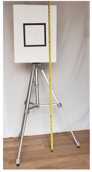 A planar surface was evaluated in this study (Figure 2). The plane was represented by a rectangular surface of about 33.7 × 43.8 cm (13.25 × 17.25 in) in size. A flat board about 6.4 mm (0.25 in) thick and made of engineered wood was coated with a white non-reflective paper. A rectangle of about 17.8 × 17.8 cm (7 × 7 in) was marked at the center of the board with a black marker. The board was mounted on a tripod with the midpoint located at about 98 cm (38.5 in) from the ground floor and aligned vertically with a level.